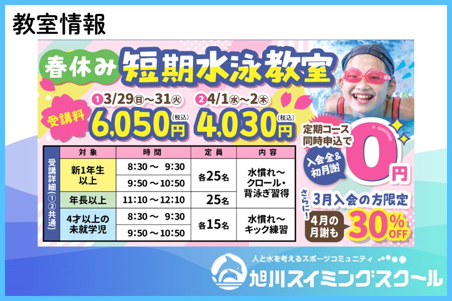 〒078-8338旭川市南8条通24丁目TEL:0166-32-1212FAX:0166-32-1241ご利用時間午前9:30~午後9:00(土曜日午後7:30)休館日:日曜日※スクールカレンダーによる。※定期点検期間/別途ご案内致します。